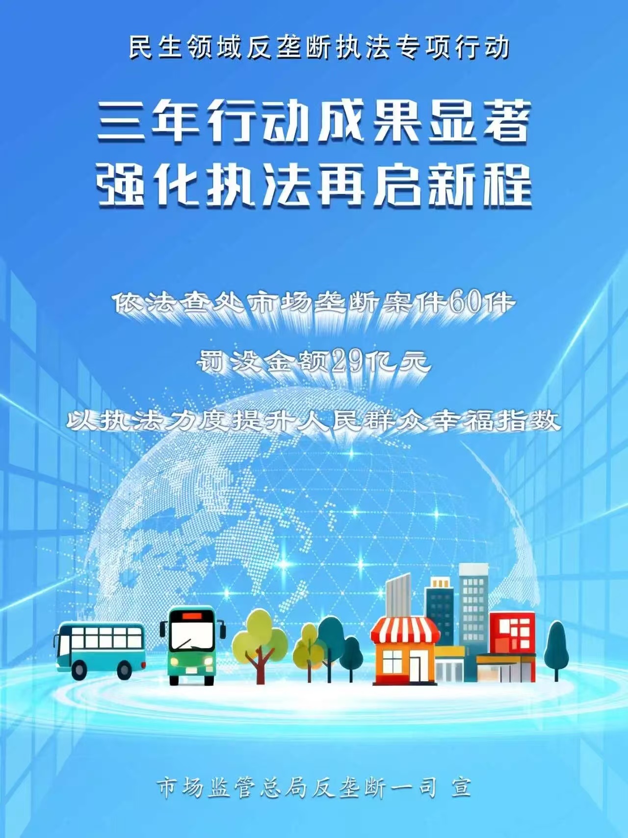 2023年以来,市场监管总局坚决贯彻落实党中央、国务院决策部署,聚焦人民群众反映强烈的突出问题,连续三年在全系统组织开展民生领域反垄断执法专项行动,依法查处市场垄断案件60件,罚没金额29亿元,切实维护公平竞争的市场秩序。坚持监管规范和促进发展并重,主动为经营主体“送法上门”,举办21期反垄断合规讲堂,解读反垄断制度规则,累计8万余人次参加,推动公平竞争理念更加深入人心。为加强公平竞争法律和政策宣传倡导,现发布三年民生领域反垄断执法专项行动海报。