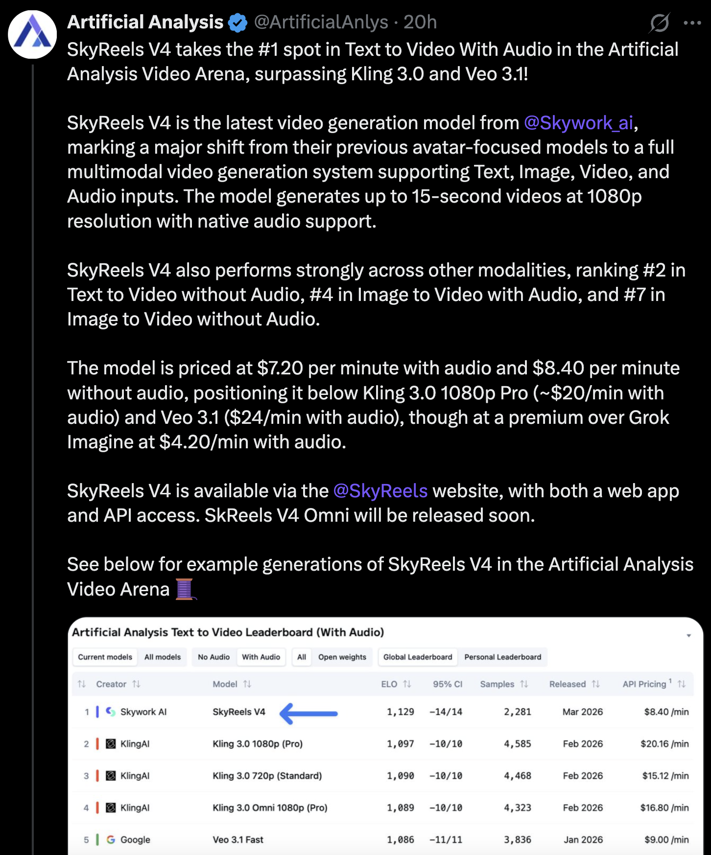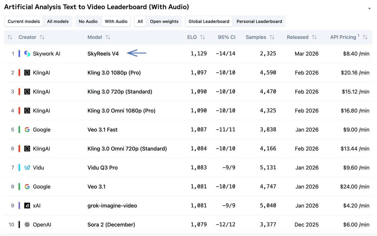 3月19日,天工AI大模型SkyReels V4登上Artificial Analysis榜单Text to Video (With Audio) 赛道全球第一,显著超越Kling 3.0、Google Veo 3.1、Vidu Q3、OpenAI Sora 2等全球主流模型,成为全球AI视频生成能力最强的大模型,标志中国AI视频生成技术实现世界级引领。