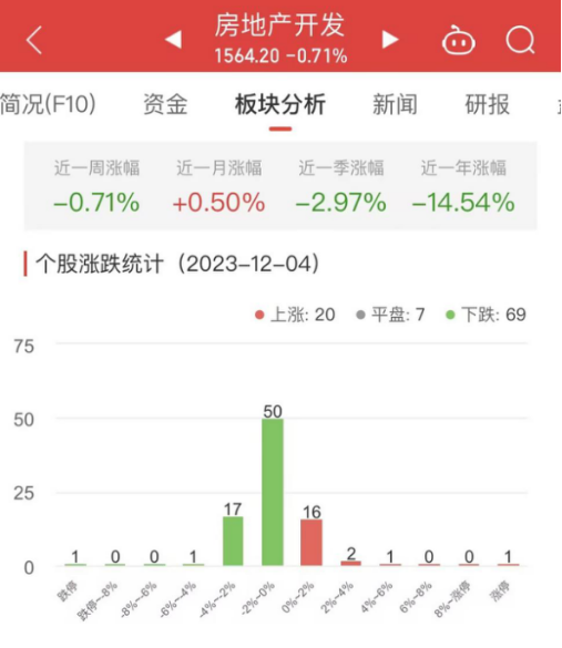 中国经济网北京12月4日讯 今日,房地产开发板块整体跌幅0.71%,其中20只股票上涨,7只股票平盘,69只股票下跌。