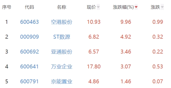 其中,空港股份、ST数源、亚通股份、万业企业、京能置业位列板块涨幅榜前五位,涨幅分别为9.96%、4.92%、3.46%、3.07%、1.46%。