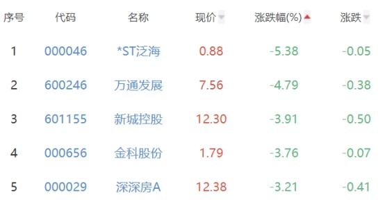 *ST泛海、万通发展、新城控股、金科股份、深深房A位列板块涨幅榜后五位,涨幅分别为-5.38%、-4.79%、-3.91%、-3.76%、-3.21%。