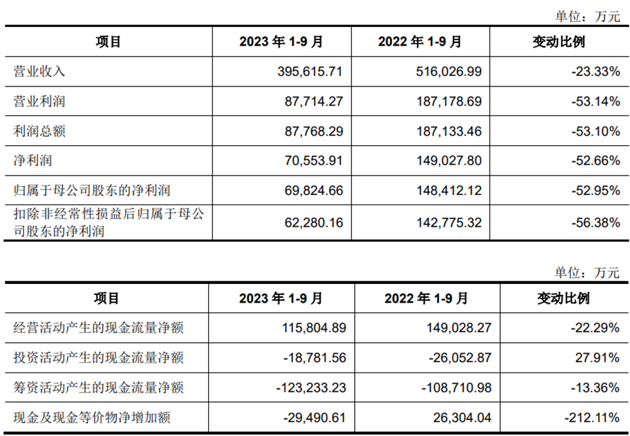 2023年1-9月,锦江航运的营业收入为395,615.71万元,同比减少23.33%;净利润为70,553.91万元,同比减少52.66%;归属于母公司股东的净利润为69,824.66万元,同比减少52.95%;扣除非经常性损益后归属于母公司股东的净利润为62,280.16万元,同比减少56.38%;经营活动产生的现金流量净额为115,804.89万元,同比减少22.29%。
