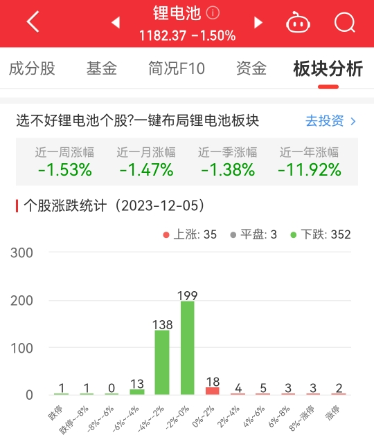 中国经济网北京12月5日讯 今日,锂电池板块整体跌幅1.50%,其中35只股票上涨,3只股票平盘,352只股票下跌。