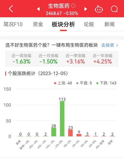 中国经济网北京12月5日讯 今日,生物医药板块整体涨幅-0.50%,其中40只股票上涨,5只股票平盘,143只股票下跌。