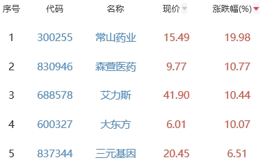 其中,常山药业、森萱医药、艾力斯、大东方、三元基因位列板块涨幅前五位,涨幅分别为19.98%、10.77%、10.44%、10.07%、6.51%。