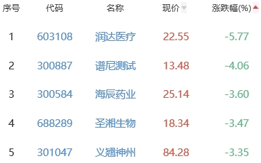 润达医疗、谱尼测试、海辰药业、圣湘生物、义翘神州位列涨幅榜后五位,涨幅分别为-5.77%、-4.06%、-3.60%、-3.47%、-3.35%。