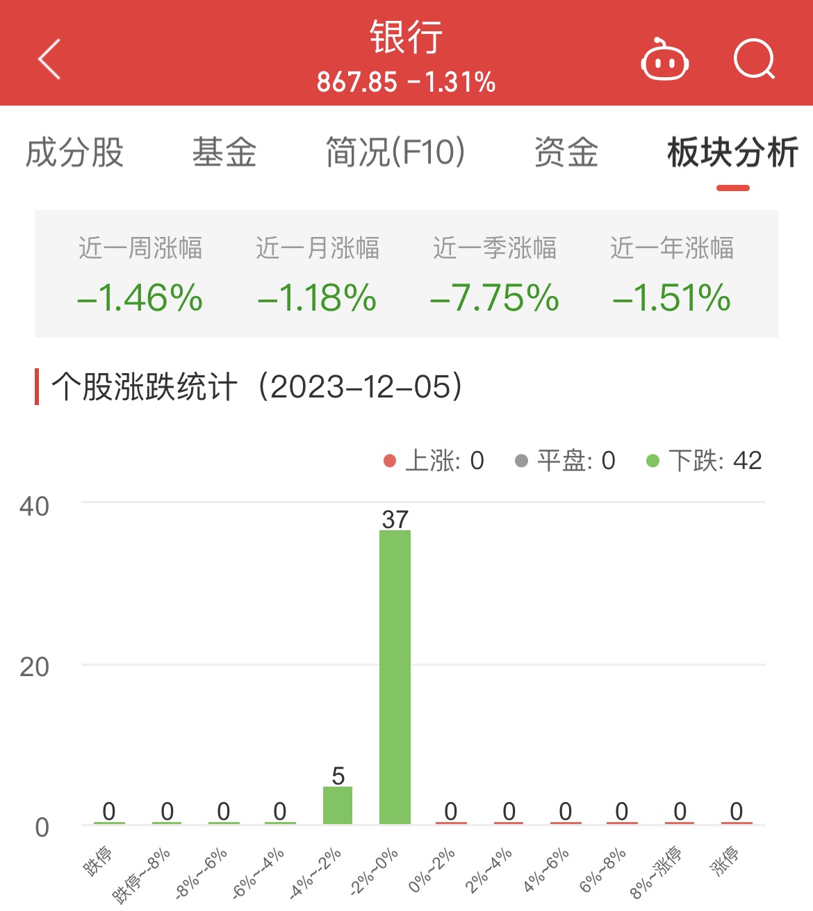中国经济网北京12月5日讯 今日,银行板块整体涨幅-1.31%,其中0只股票上涨,0只股票平盘,42只股票下跌。