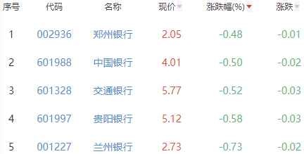 其中,郑州银行、中国银行、交通银行、贵阳银行和兰州银行位列板块涨幅前五位,涨幅分别为-0.48%、-0.50%、-0.52%、-0.58%和-0.73%。
