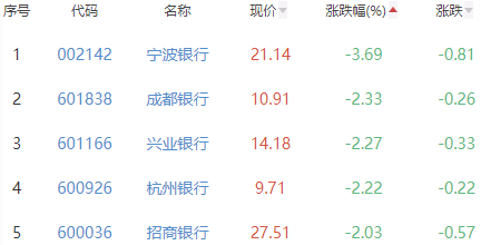 宁波银行、成都银行、兴业银行、杭州银行和招商银行位列涨幅榜后五位,涨幅分别为-3.69%、-2.33%、-2.27%、-2.22%和-2.03%。