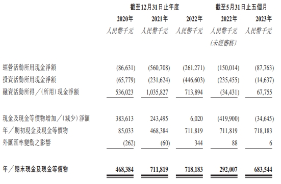 截至2020年、2021年、2022年12月31日止年度以及截至2022年及2023年5月31日止五个月,公司分别录得经营活动所用现金净额人民币86.6百万元、人民币560.7百万元、人民币261.3百万元、人民币150.0百万元及人民币87.8百万元。