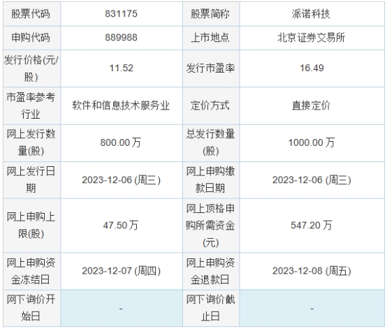 派诺科技2023年12月4日披露向不特定合格投资者公开发行股票并在北京证券交易所上市发行公告,若本次发行成功,超额配售选择权行使前,预计发行人募集资金总额为11,520.00万元,扣除发行费用1,815.06万元(不含增值税)后,预计募集资金净额为9,704.94万元;若超额配售选择权全额行使,预计发行人募集资金总额为13,248.00万元,扣除发行费用1,974.83万元(不含增值税)后,预计募集资金净额为11,273.17万元。