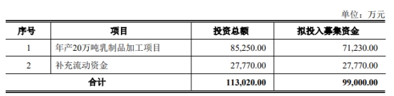 天润乳业2023年11月25日披露向不特定对象发行可转换公司债券募集说明书(上会稿),公司本次向不特定对象发行可转换公司债券拟募集资金总额不超过99,000.00万元(含本数),所募集资金扣除发行费用后,拟用于年产20万吨乳制品加工项目、补充流动资金。