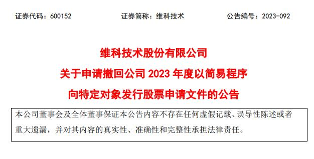 中国经济网北京12月6日讯 维科技术(600152.SH)昨晚披露《关于申请撤回公司2023年度以简易程序向特定对象发行股票申请文件的公告》。