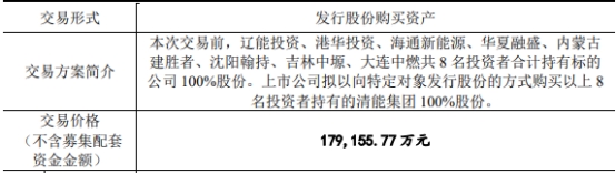 2023年9月22日,辽宁能源发布的发行股份购买资产并募集配套资金暨关联交易报告书(草案)(修订稿)显示,本次交易前,辽能投资、港华投资、海通新能源、华夏融盛、内蒙古建胜者、沈阳翰持、吉林中塬、大连中燃共8名投资者合计持有标的公司100%股份。上市公司拟以向特定对象发行股份的方式购买以上8名投资者持有的清能集团100%股份。交易价格为179,155.77万元。