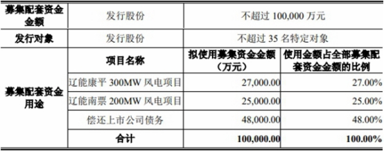 另外,辽宁能源拟向不超过35名(含)符合条件的特定投资者募集配套资金金额不超过100,000万元,分别用于辽能康平300MW风电项目、辽能南票200MW风电项目、偿还上市公司债务。