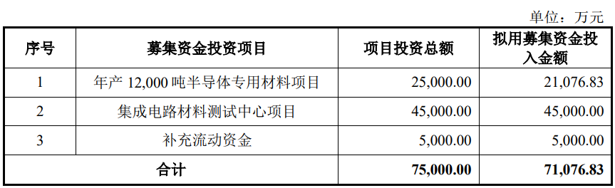 艾森股份本次公开发行募集资金总额为61,759.44万元,扣除发行费用后的募集资金净额为54,449.71万元。公司最终募集资金净额比原计划少16,627.12万元。艾森股份2023年12月1日披露的招股说明书显示,公司拟募集资金71,076.83万元,用于年产12,000吨半导体专用材料项目、集成电路材料测试中心项目、补充流动资金。