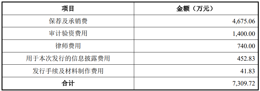 艾森股份本次发行费用合计7,309.72万元,其中保荐及承销费4,675.06万元。