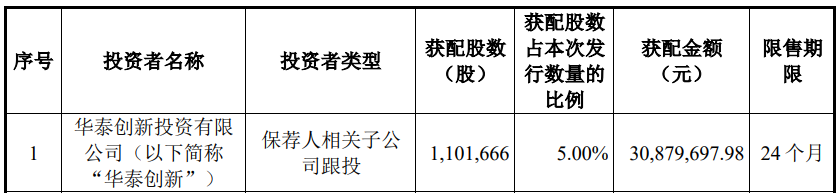 华泰联合证券按照相关规定参与艾森股份本次发行的战略配售,跟投主体为子公司华泰创新投资有限公司(简称“华泰创新”),华泰创新获配股份数量1,101,666股,占本次公开发行股份数量的5.00%,获配金额30,879,697.98元。