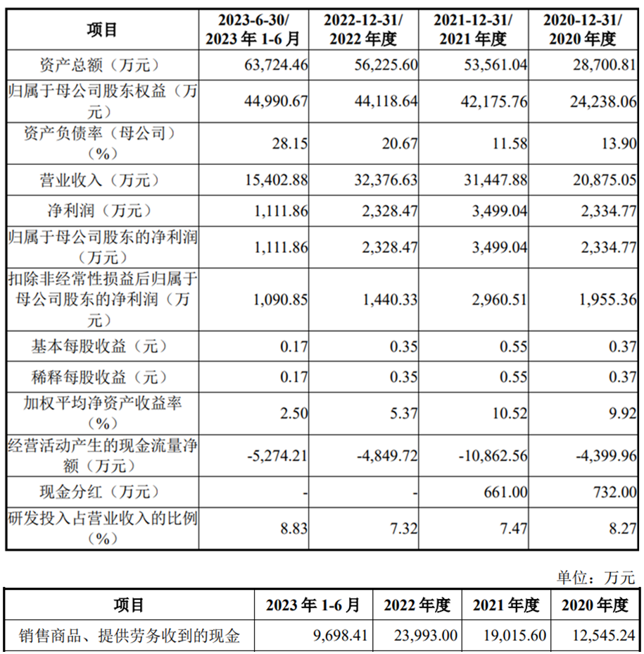 2020年至2023年1-6月,艾森股份的营业收入分别为20,875.05万元、31,447.88万元、32,376.63万元和15,402.88万元;净利润/归属于母公司股东的净利润分别为2,334.77万元、3,499.04万元、2,328.47万元和1,111.86万元;扣除非经常性损益后归属于母公司股东的净利润分别为1,955.36万元、2,960.51万元、1,440.33万元、1,090.85万元。
