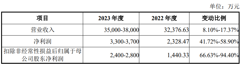 2023年度,艾森股份的营业收入预计为35,000万元至38,000万元,较上年同期增长8.10%至17.37%;净利润预计为3,300万元至3,700万元,同比增长41.72%至58.90%;扣除非经常性损益后归属于母公司股东净利润预计为2,400万元至2,800万元,同比增长66.63%至94.40%。