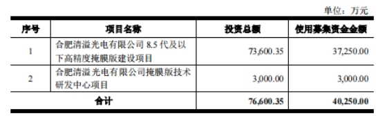清溢光电发行募集资金总额为58,650.40万元,募集资金净额为52,233.72万元,较原拟募资多11983.72万元。据2019年11月15日披露的招股书显示,公司原拟募集资金40,250.00万元,用于合肥清溢光电有限公司8.5代及以下高精度掩膜版建设项目、合肥清溢光电有限公司掩膜版技术研发中心项目。