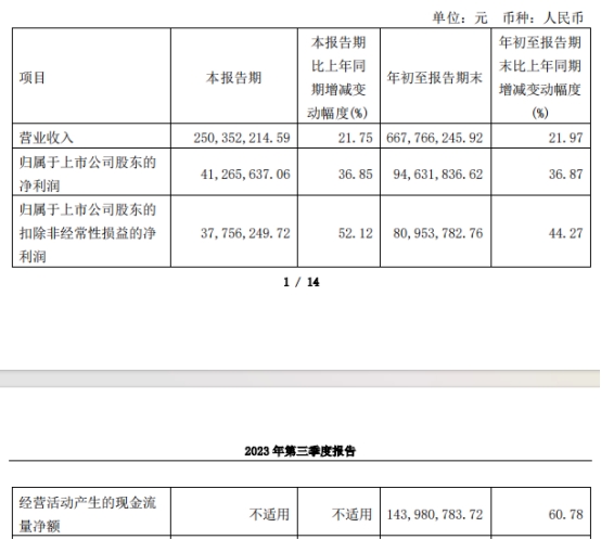 今年前三季度,公司实现营业收入6.68亿元,同比增长21.97%;实现归属于上市公司股东的净利润9463.18万元,同比增长36.87%;实现归属于上市公司股东的扣除非经常性损益的净利润8095.38万元,同比增长44.27%,经营活动产生的现金流量净额为1.44亿元,同比增长60.78%。