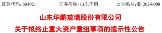 中国经济网北京3月1日讯 山东华鹏(603021.SH)昨晚披露了关于拟终止重大资产重组事项的提示性公告。山东华鹏公告称,公司拟终止重大资产重组事项。本次重大资产重组终止尚需经公司相关程序审议通过。公司将于近期召开董事会等决策程序,审议与终止本次重大资产重组相关的事项,公司将及时披露与终止本次重大资产重组相关事项的公告。