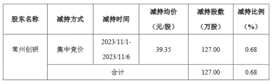 公告显示,2023年11月1日至2023年11月6日,常州创研通过集中竞价方式减持公司股票127.00万股,减持比例0.68%,减持均价39.35元/股,套现约4997.45万元。