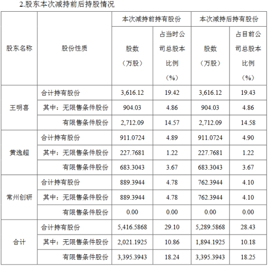 本次减持前,常州创研持有公司股份889.3944万股,占当时公司总股本比例4.78%;本次减持后,常州创研持有公司股762.3944万股,占当时公司总股本比例4.10%。