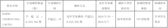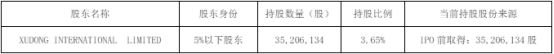 截至公告披露之日,XUDONG INTERNATIONAL LIMITED持有公司股份35,206,134股,占公司总股本的3.65%,股份来源为公司首次公开发行取得。