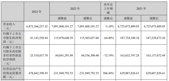 中国经济网北京5月8日讯 粤海饲料(001313.SZ)4月29日披露2023年年度报告显示,公司2023年实现营业收入68.72亿元,同比下降3.10%;归属于上市公司股东的净利润4114.36万元,同比下降64.40%;归属于上市公司股东的扣除非经常性损益后的净利润2351.08万元,同比下降72.19%;经营活动产生的现金流量净额4.79亿元,同比增长306.44%。