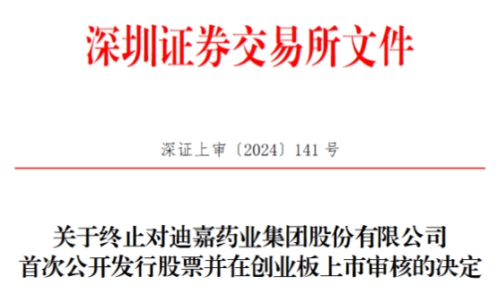 中国经济网北京6月13日讯 深交所网站昨日发布关于终止对迪嘉药业集团股份有限公司(简称“迪嘉药业”)首次公开发行股票并在创业板上市审核的决定。