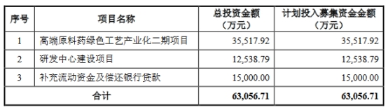 迪嘉药业原拟在深交所创业板公开发行股票数量不超过6,360万股,占发行后总股本的比例不低于10%,且不超过15%。公司原拟募集资金63,056.71万元,用于高端原料药绿色工艺产业化二期项目、研发中心建设项目、补充流动资金及偿还银行贷款。