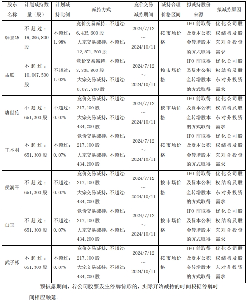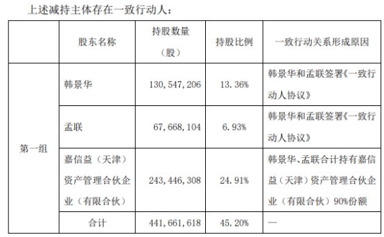 其中:韩景华和孟联通过集中竞价交易方式合计减持公司股份不超过9,771,400股,不超过公司总股本的1%;通过大宗交易方式合计减持公司股份不超过19,542,900股,不超过公司总股本的2%。其他五名自然人股东通过集中竞价交易方式合计减持公司股份不超过1,085,500股,不超过公司总股本的0.11%;通过大宗交易方式合计减持公司股份不超过2,171,000股,不超过公司总股本的0.22%。