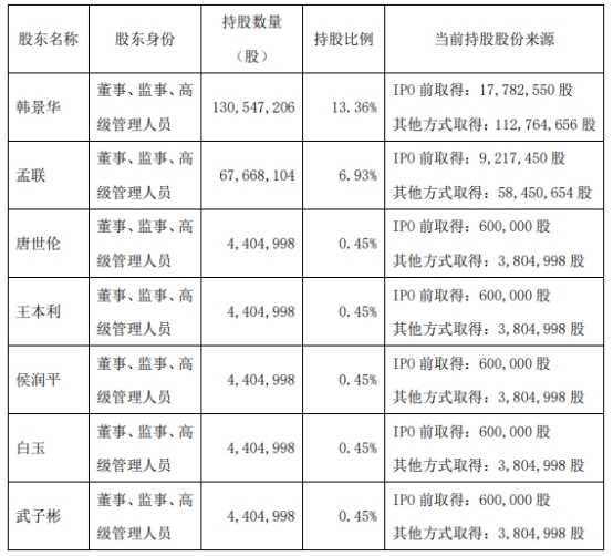 截至2024年6月20日,韩景华、孟联、唐世伦、王本利、侯润平、白玉、武子彬七名自然人股东合计持有公司股份220,240,300股,占公司总股本的22.54%。