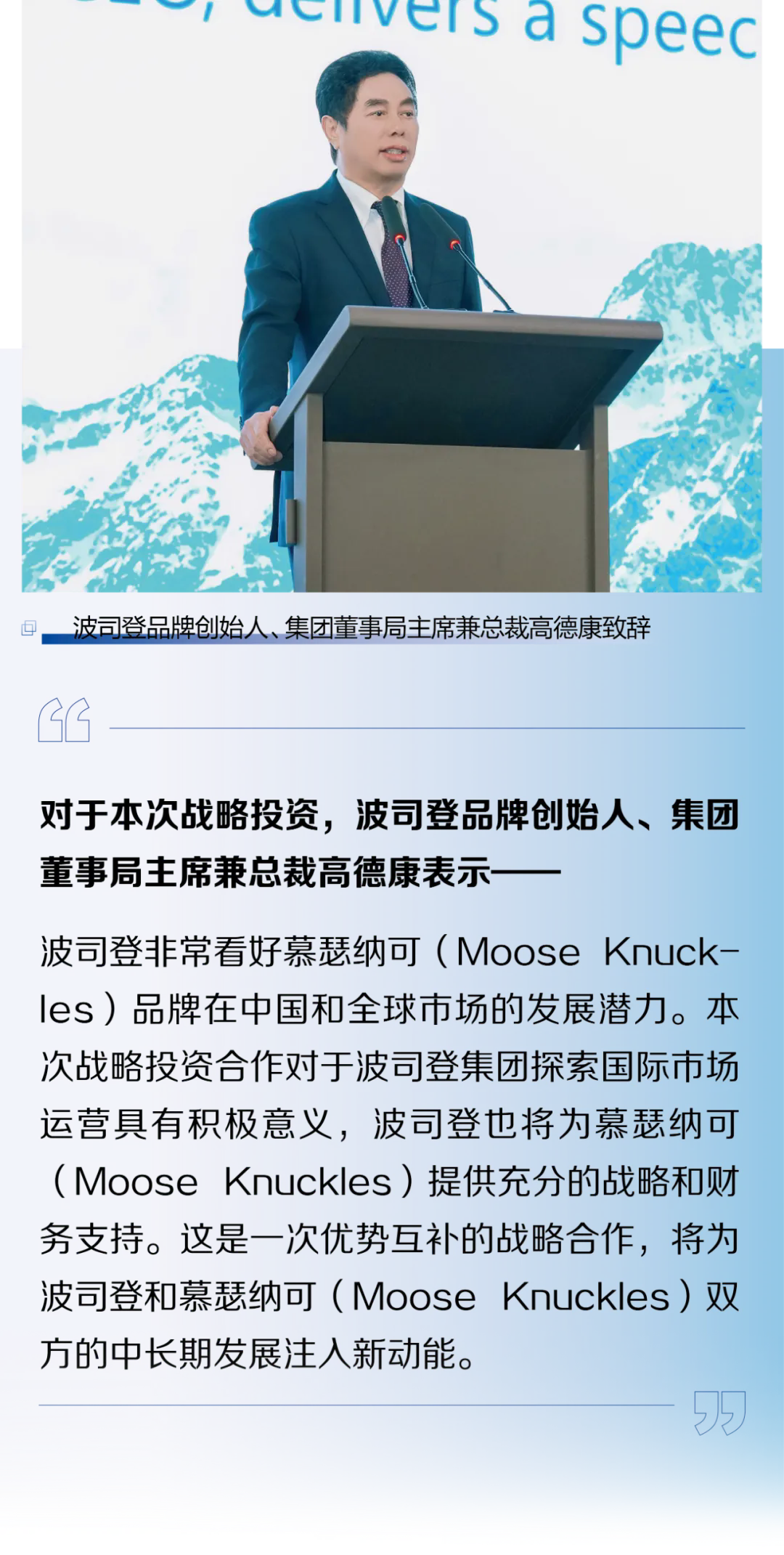 10月9日,全球领先羽绒服品牌商波司登宣布战略投资国际奢侈羽绒服品牌慕瑟纳可(Moose Knuckles),此次投资是波司登集团聚焦羽绒服核心主业、拓展国际业务版图的重要举措。通过本次投资,波司登将成为Moose Knuckles的关键投资者,全球知名私募股权投资机构凯辉基金仍将是Moose Knuckles的控股股东。