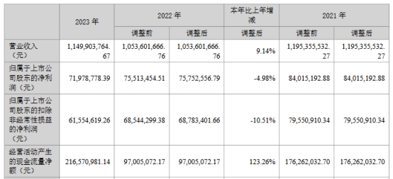 2021年至2023年,南王科技营业收入分别为11.95亿元、10.54亿元、11.50亿元,归属于上市公司股东的净利润分别为8401.52万元、7575.26万元、7197.88万元,归属于上市公司股东的扣除非经常性损益的净利润分别为7955.09万元、6878.34万元、6155.46万元,经营活动产生的现金流量净额分别为1.76亿元、9700.51万元、2.17亿元。