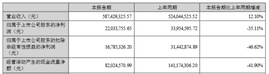 2024年1-6月,南王科技营业收入5.87亿元,同比增长12.10%;归属于上市公司股东的净利润2203.38万元,同比下降35.11%;归属于上市公司股东的扣除非经常性损益的净利润1678.53万元,同比下降46.62%;经营活动产生的现金流量净额为8202.46万元,同比下降41.90%。