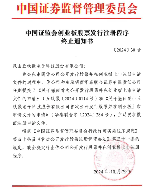 据中国证监会创业板股票发行注册程序终止通知书([2024]30号),证监会在审阅昆山丘钛微电子科技股份有限公司(简称“丘钛微”)公开发行股票并在创业板上市注册申请文件的过程中,丘钛微和主承销商华泰联合证券有限责任公司分别提交了《关于撤回首次公开发行股票并在创业板上市申请文件的申请》(丘钛微[2024]0114号)和《关于撤回昆山丘钛微电子科技股份有限公司首次公开发行股票并在创业板上市申请文件的申请》(华泰联合字[2024]284号),主动要求撤回注册申请文件。