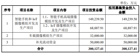 丘钛微原拟募资300,127.41万元,用于智能手机和IoT摄像模组开发及生产项目、车载摄像模组生产项目和补充流动资金。