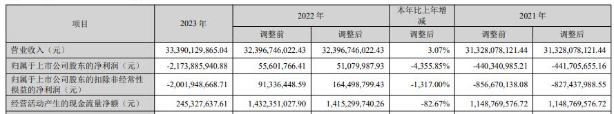2023年,大北农实现营业收入333.90亿元,同比增3.07%;归属于上市公司股东的净利润-21.74亿元,上年同期为5108.00万元;归属于上市公司股东的扣除非经常性损益的净利润-20.02亿元,上年同期为1.64亿元;经营活动产生的现金流量净额2.45亿元,同比下降82.67%。