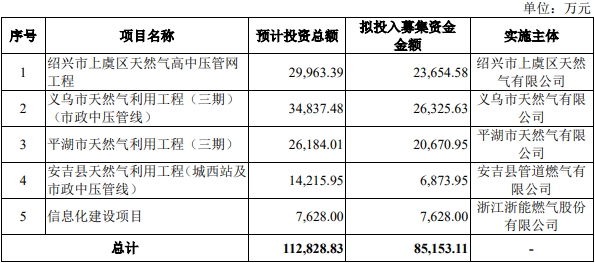 浙能燃气原拟募集资金85,153.11万元,分别用于绍兴市上虞区天然气高中压管网工程、义乌市天然气利用工程(三期)(市政中压管线)、平湖市天然气利用工程(三期)、安吉县天然气利用工程(城西站及市政中压管线)、信息化建设项目。