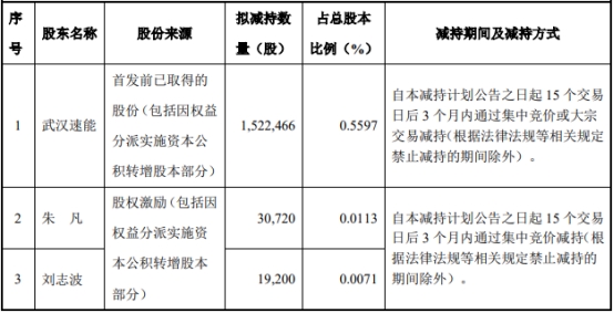 持有公司股份6,089,867股(占公司总股本比例2.2387%,以截至2025年2月19日总股本273,087,920股剔除回购专用账户后的股本272,025,460股为计算依据,下同)的特定股东武汉速能(公司控股股东、实际控制人李志刚之一致行动人)拟自减持计划公告之日起15个交易日后3个月内通过集中竞价或大宗交易减持公司股份不超过1,522,466股(占公司总股本的0.5597%)。