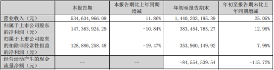 2024年前三季度,公司实现营业收入14.40亿元,同比增长25.05%;归属于上市公司股东的净利润3.83亿元,同比增长12.95%;扣除非经常性损益后的净利润3.54亿元,同比增长7.99%;经营活动产生的现金流量净额为-8455.45万元。