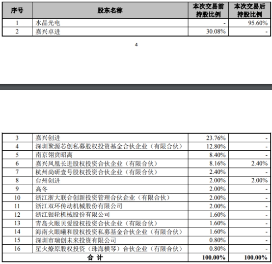 嘉兴创进为本次收购对象之一,当前持有广东埃科思23.76%股权。水晶光电为嘉兴创进有限合伙人,持有嘉兴创进99.85%股权,且水晶光电在嘉兴创进投资决策委员会中拥有2个委员席位。