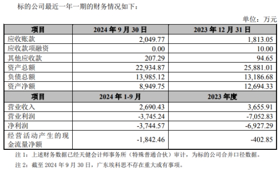 2023年度、2024年前三季度,广东埃科思营业收入分别为3,655.91万元、2,690.43万元,净利润分别为-6,927.29万元、-3,744.57万元,经营活动产生的现金流量净额分别为-402.85万元、-1,842.46万元。