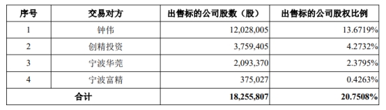 东睦股份同时披露的发行股份及支付现金购买资产暨关联交易预案显示,东睦股份拟通过发行股份及支付现金的方式向钟伟、创精投资、宁波华莞、宁波富精共4名交易对方购买其合计持有的上海富驰20.75%股权。各交易对方拟出售的股份数量及股权比例如下表所示: