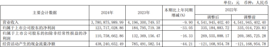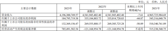 悦康药业的业绩已连降三年。2021年、2022年、2023年,悦康药业的营业收入分别为49.66亿元、45.42亿元、41.96亿元;归属于上市公司股东的净利润分别为5.45亿元、3.35亿元、1.85亿元;归属于上市公司股东的扣除非经常性损益的净利润分别为5.10亿元、2.70亿元、1.32亿元;经营活动产生的现金流量净额分别为5.15亿元、-1.21亿元、7.85亿元。