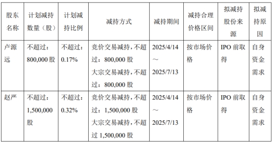 公司监事卢源远、董事赵严因自身资金需要,计划自公告披露之日起15个交易日后的3个月内通过集中竞价或大宗交易方式合计减持公司股份分别不超过80万股、150万股,分别不超过公司总股本的0.17%、0.32%,具体减持价格将根据减持实施时的市场价格确定,拟减持股份来源均为IPO前取得。