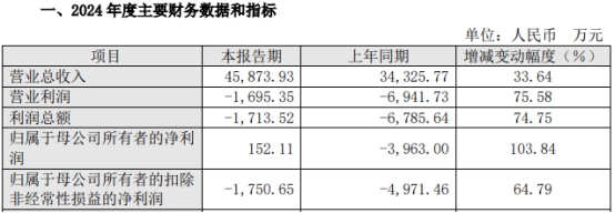赛诺医疗2024年度业绩快报公告显示,2024年,公司实现营业总收入4.59亿元,同比增长33.64%;归属于母公司所有者的净利润152.11万元,归属于母公司所有者的扣除非经常性损益的净利润-1750.65万元。